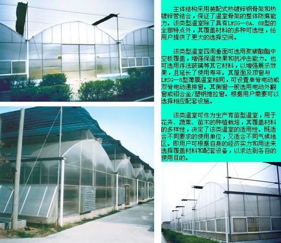 主体结构采用装配式热镀锌钢骨架和热镀锌管结合,保证温室骨架的整体防腐能力。该类型温室除了具有LWSG-8A、8B型的全部特点外,其覆盖材料的多种可选性,给用户提供了更大的选择空间。